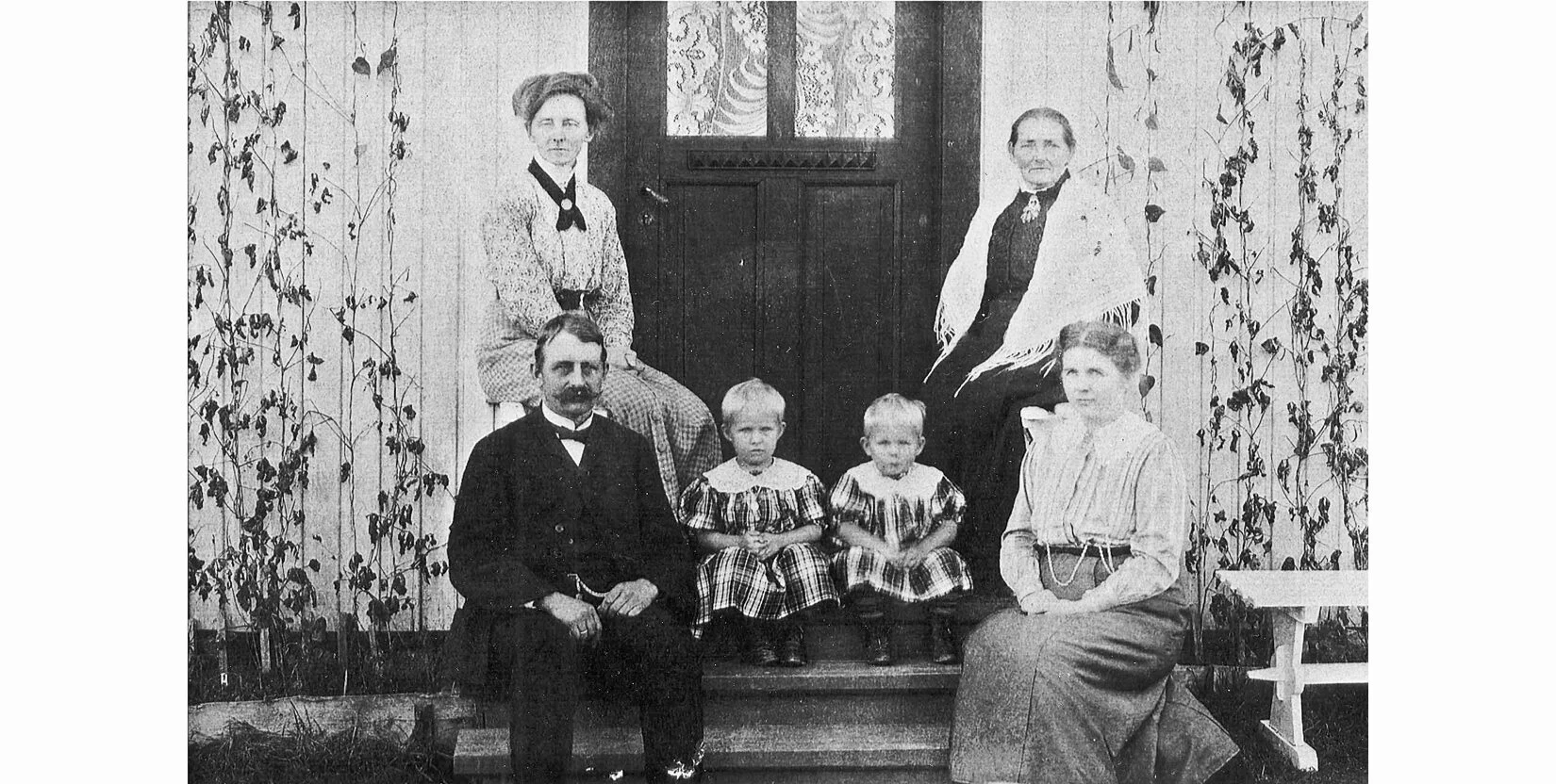 De voksne foran på bildet er mine og Berits besteforeldre Johan Bernhard Johannessen og Karen Helga (f. Holt). I midten sitter deres to barn dengang – ca 1912 – Marie Borgny (vår mor f. 1907) og Kirsten Johanne (f. 1909). De fikk seinere sønnen Per Kittil. Her er de på besøk i huset i Kurdligaden (Sofiesgate), der Johans mor Maren sitter på gelenderet bak til høyre, og hans søster Thora Marie, som nylig hadde vært med på «Kvindelisten», sitter bak til venstre.